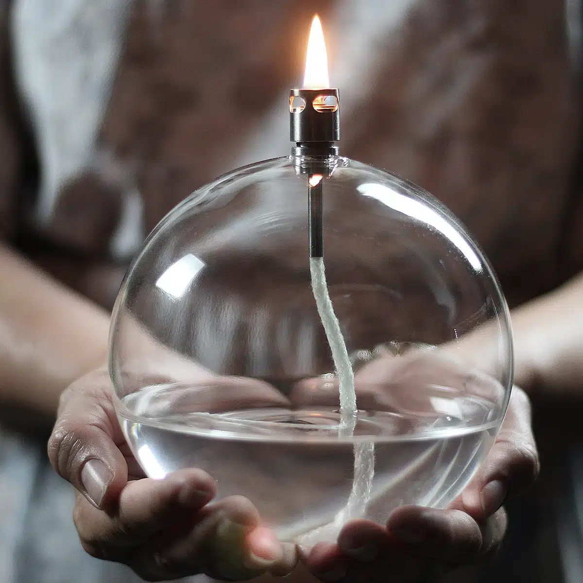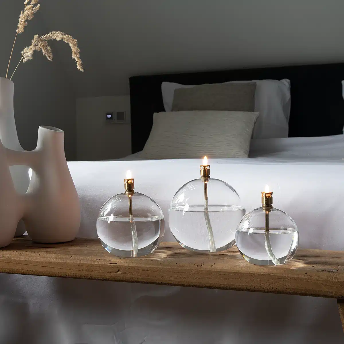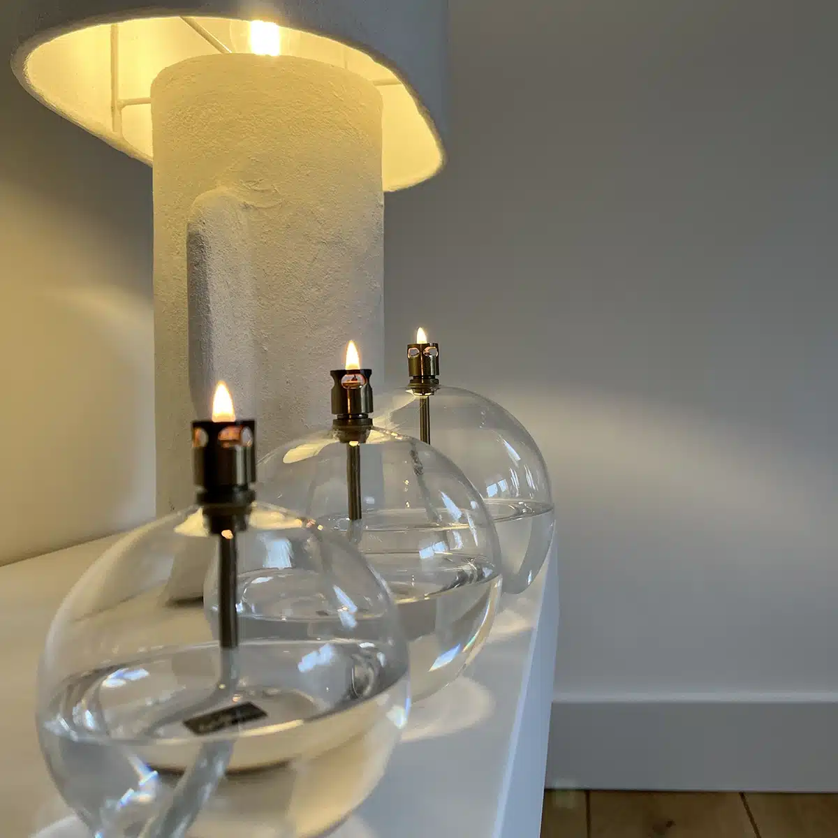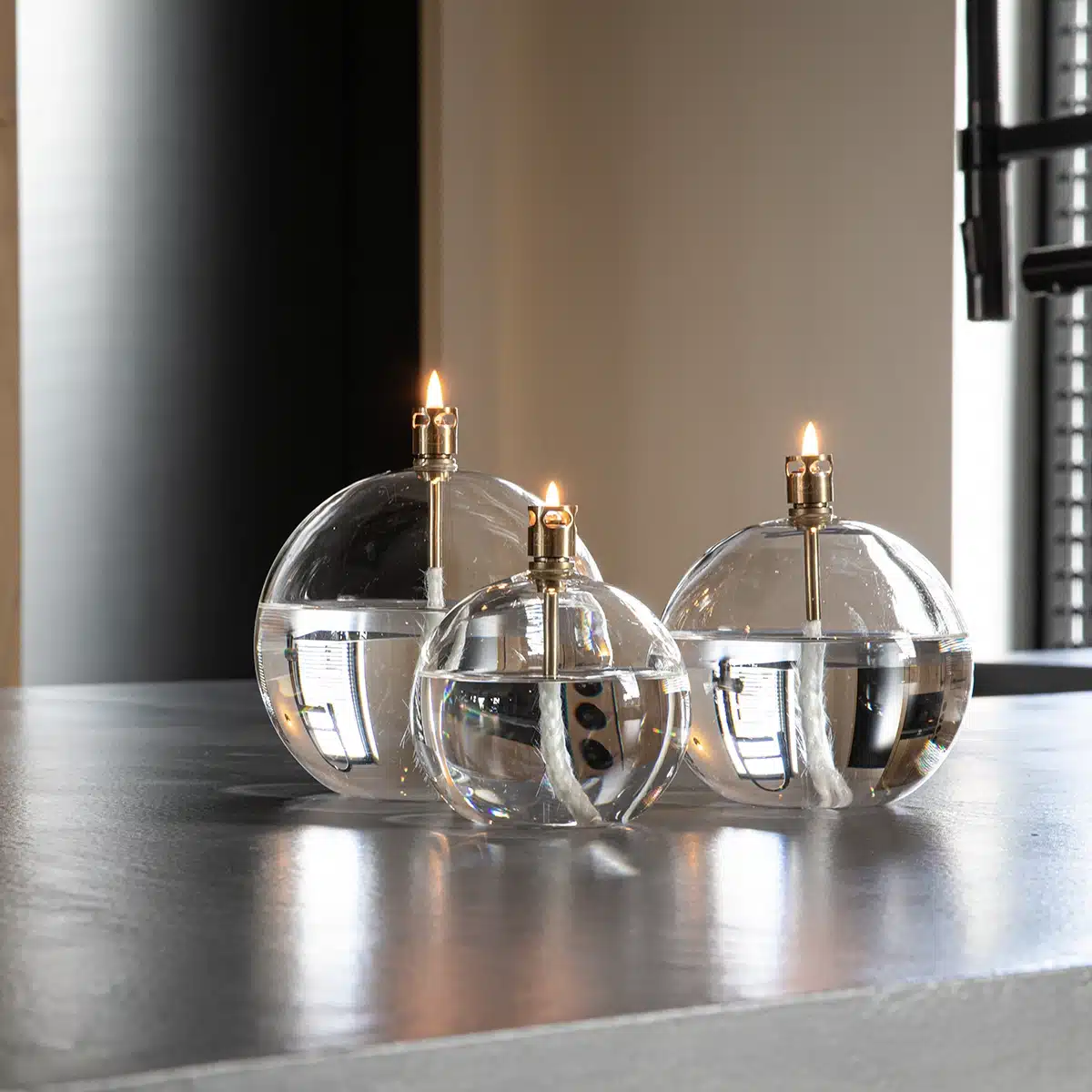 Lampe à huile minimaliste sphère. Elle est idéale pour créer une ambiance cosy et chaleureuse à votre intérieur. Cette lampe à huile verre et laiton est très simple d’utilisation. Il suffit de dévisser la partie supérieure, de placer l’entonnoir et verser la paraffine liquide. La mèche en fibre de verre vous suivra quelques années sans problème. Elle est quasiment inusable.